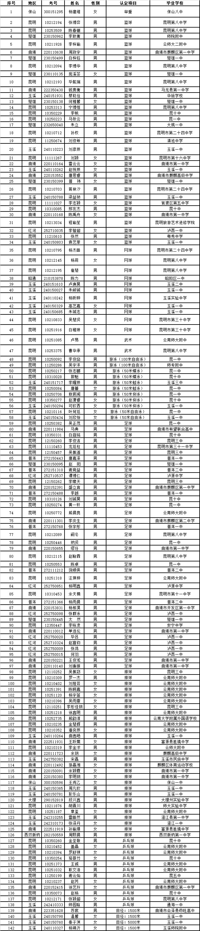 云南省2015年参加普通高校招生全国统一考试获得二级运动员证书的考生公示名单