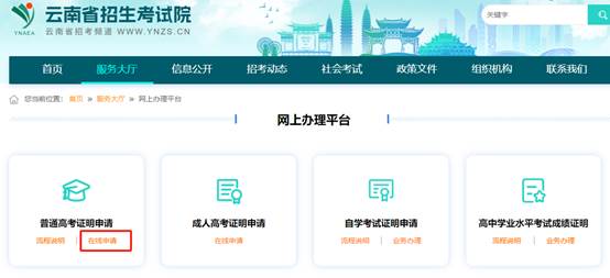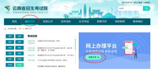 1. 考生访问云南省招生考试院官网www.ynzs.cn,点击栏目上“服务大厅”,然后点击右侧网上办理平台“我要办理”;