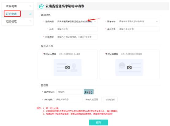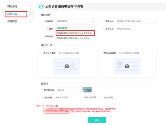 3. 类别选择“开具高考成绩证明”(请注意成绩证明不包含录取信息且两种证明仅可申请一种),选择“高考年份”并输入“姓名”、“身份证号”、“开具证明用途”,上传身份证正反面照片,输入“手机号”、“图形验证码”,点击“获取验证码”通过手机收取验证码,最后填入“验证码”并点击“提交”按钮。