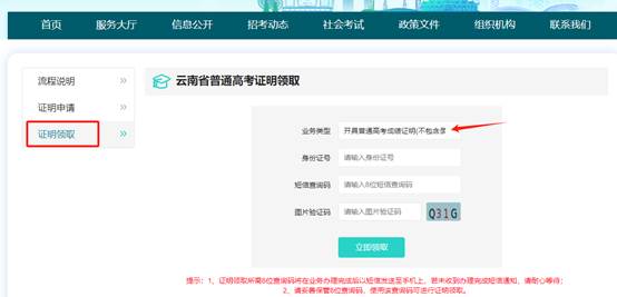 5.凭短信内的“查询码”至“证明领取”栏目,选择办理的“业务类型”,输入“身份证号”、“短信查询码”、“图片验证码”,进行证明下载领取。