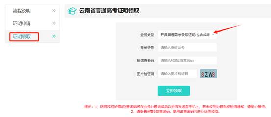 5. 凭短信内的“查询码”至“证明领取”栏目,选择办理的“业务类型”,输入“身份证号”、“短信查询码”、“图片验证码”,进行证明下载领取;